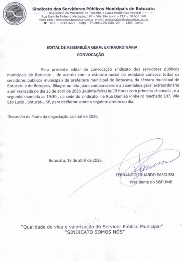O Sispumb – Sindicato dos Servidores Públicos Municipais de Botucatu publicou nesta quinta-feira, 16 de abril, o edital da negociação salarial 2026. A convocação é para a assembleia a ser realizada nesta quinta, dia 23 de abril, às 19h e 19h30, primeira e segunda chamada, na sua sede, localizada na Rua Damião Pinheiro Machado, 197, na Vila São Lúcio.