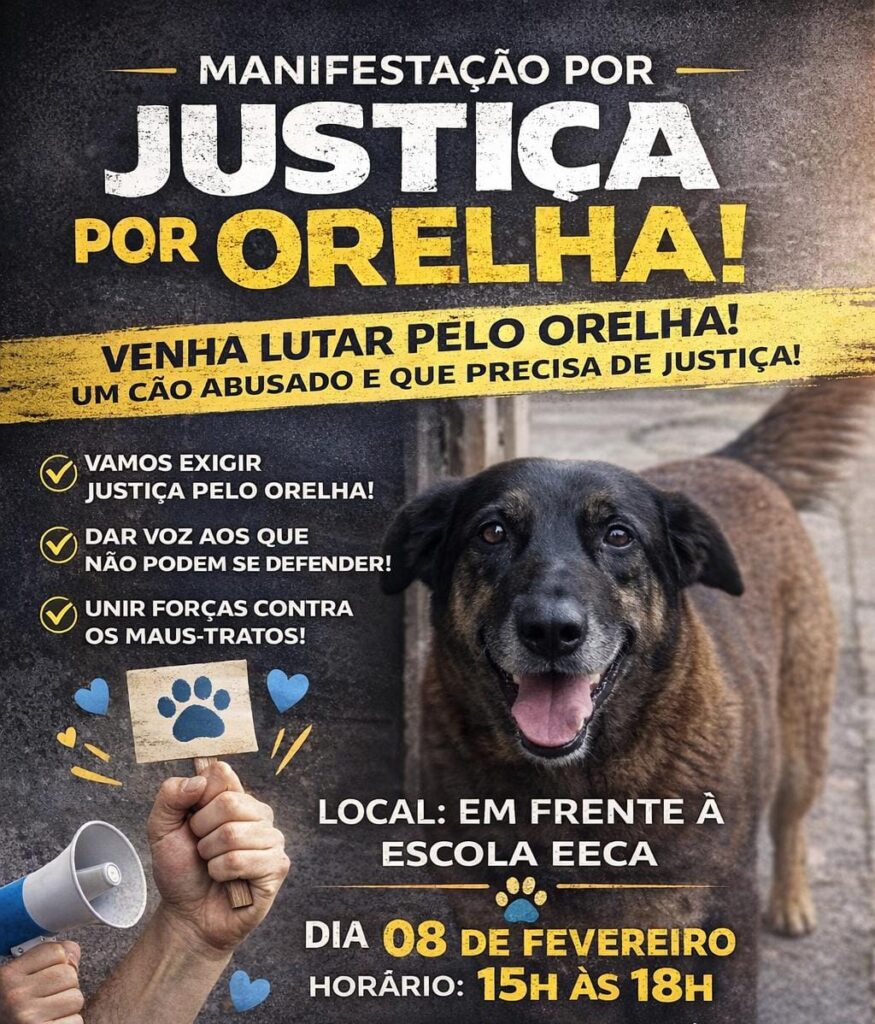 “A Manifestação por Justiça pelo Orelha não é só sobre um caso. É sobre todos os animais que sofrem calados, que apanham, que vivem no abandono e que não conseguem pedir socorro. Quem puder, leve seu animal na coleira e traga cartazes. Cartazes com pedidos de justiça, com mensagens de amor, com frases que representem aqueles que não tem voz. Cada cartaz é um grito por respeito.