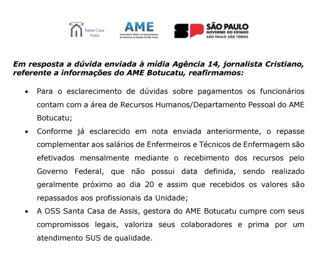 A reportagem do 14News foi procurada novamente por funcionários do AME – Ambulatório Médico de Especialidades para pedir uma data mais precisa para receber os pagamentos no final do ano.