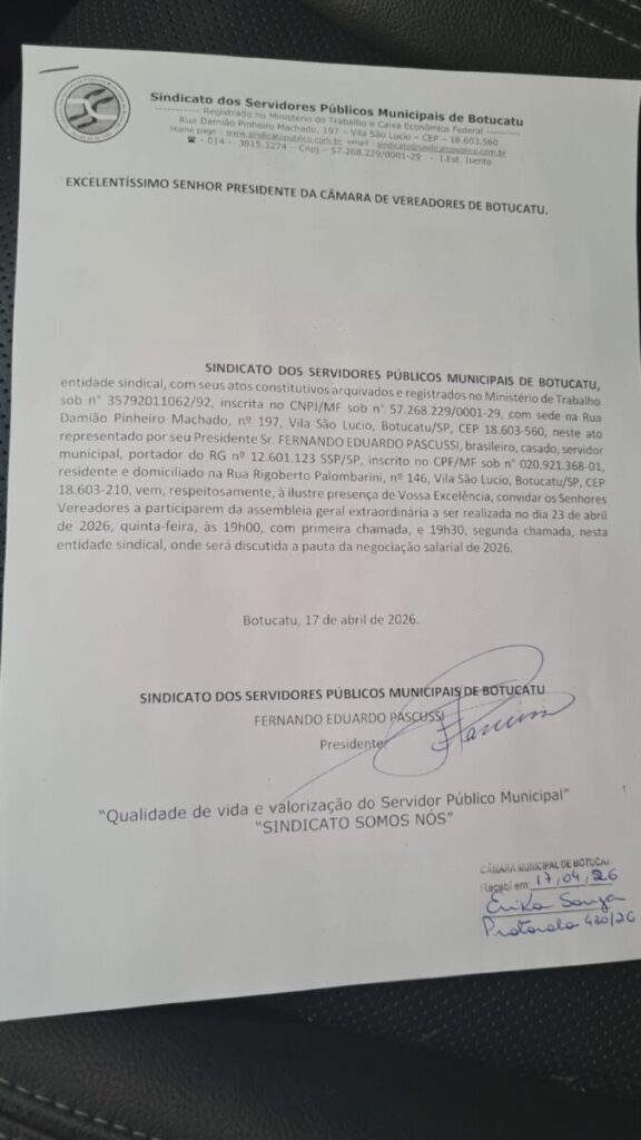Nesta sexta-feira, 17 de abril de 2026, o SISPUMB – Sindicato dos Servidores Públicos Municipais de Botucatu protocolou na Câmara Municipal convite a todos os vereadores para que participem das pautas e percentual do reajuste deste ano.