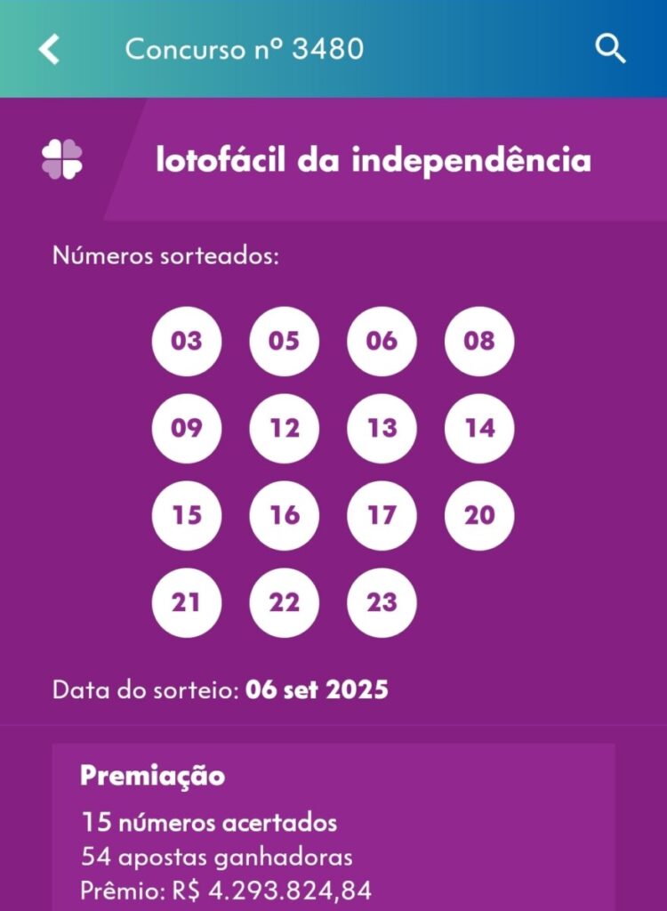 O concurso número 3.480 da Lotofácil da Independência, realizado neste sábado, em São Paulo, teve 54 apostas que acertaram os 15 números sorteados: 03, 05, 06, 08, 09, 12, 13, 14, 15, 16, 17, 20, 21, 22 e 23.