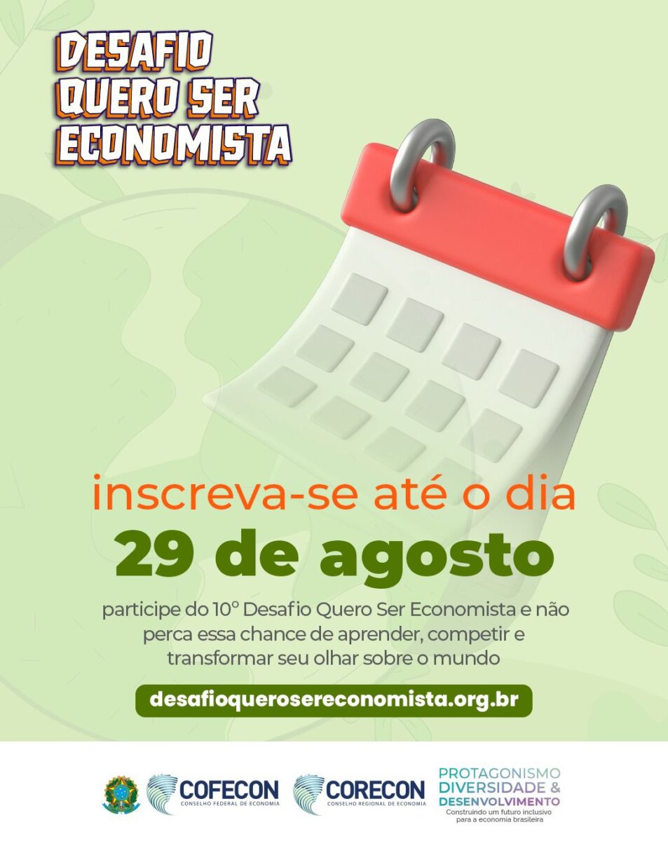 O COFECON – Conselho Federal de Economia divulgou que o desafio “Quero Ser Economista” está com inscrições abertas até sexta-feira, 29 de agosto.