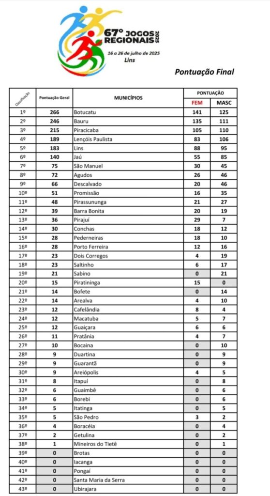 Nesta sexta-feira, 25 de julho, a Secretária de Esportes e Promoção da Qualidade de Vida de Botucatu, Clarita Balestrin, confirmou a cidade como a campeã dos Jogos Regionais em Lins.