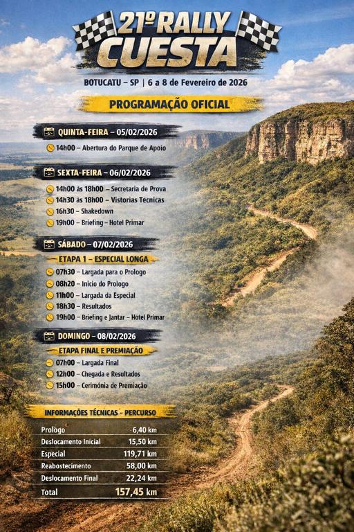 Pilotos e navegadores da modalidade Baja iniciam neste fim de semana, em Botucatu (SP), a disputa da temporada 2026 do Campeonato Brasileiro de Rally Baja. O tradicional Rally Cuesta chega à sua 21ª edição consolidado como uma das provas mais completas e técnicas do calendário nacional, reunindo competidores das categorias motos e UTVs em um percurso desafiador no interior paulista.