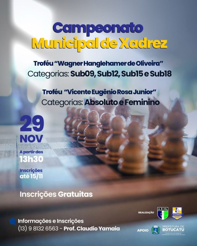 Os amantes do xadrez já podem anotar na agenda: no dia 29 de novembro de 2025, a partir das 14h, será realizado o Campeonato Municipal de Xadrez de Botucatu, reunindo competidores de diversas idades e níveis.