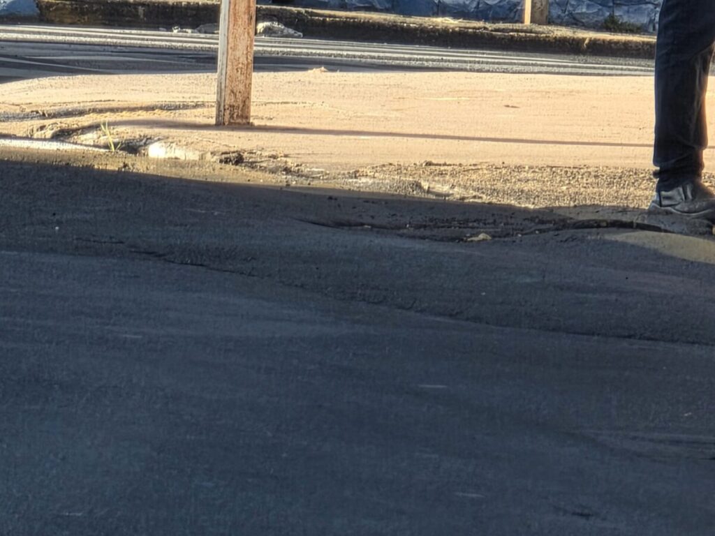 A reportagem esteve no local. Existe deformação no asfalto em frente ao ponto de ônibus. O local necessita de galerias para evitar enxurrada danificando o asfalto. No mesmo trecho há tampões da rede de esgoto desnivelados com o asfalto gerando risco no trânsito.