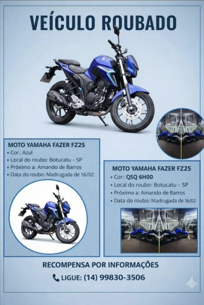 Segundo informações, 4 homens colocaram a moto modelo Fazer Azul em um veículo tipo Fiorino e fugiram.