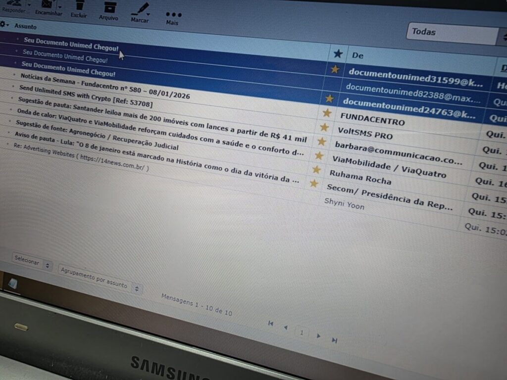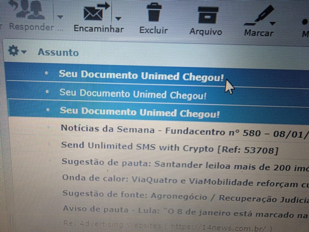 E-mails falsos enviados a moradores de Botucatu usam o nome da Unimed para tentar aplicar golpes. A mensagem diz “Seu documento Unimed Chegou!”. Esses correios eletrônicos chegaram entre quinta e sexta-feira, 8 e 9 de janeiro de 2026.