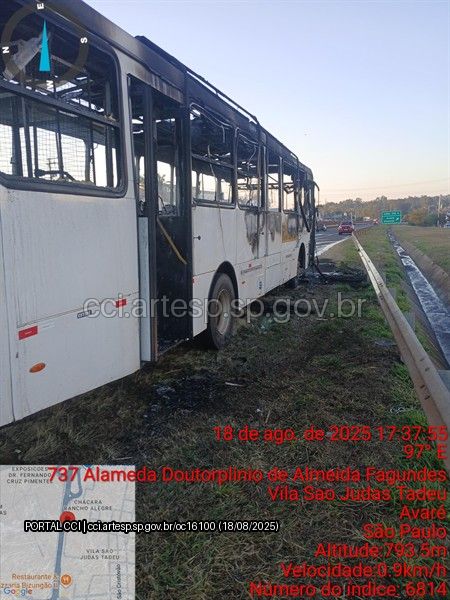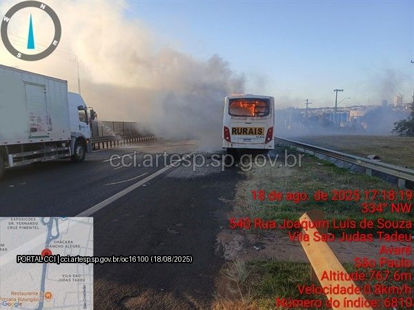 Um ônibus que transportava trabalhadores rurais pegou fogo na Rodovia Joao Mellão (SP 255), em Avaré, na tarde desta segunda-feira, 18 de agosto de 2025.