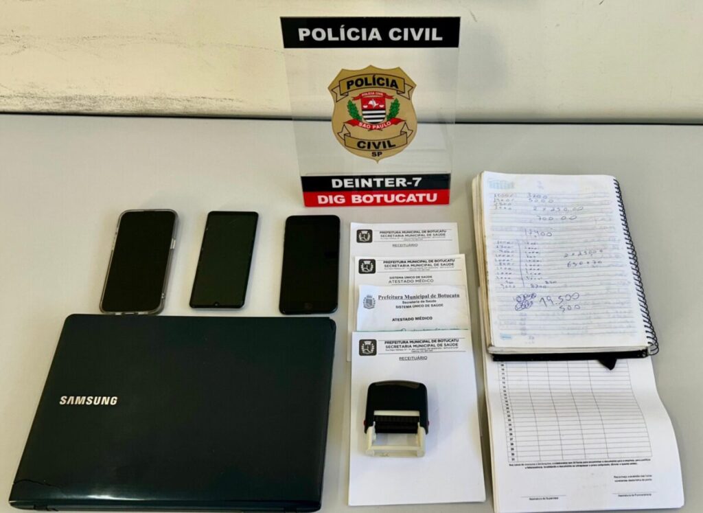 Durante os trabalhos foram apreendidos vários instrumentos destinados à falsificação de atestados médicos, inclusive computador, celulares, carimbos de médicos e receituários em branco.
