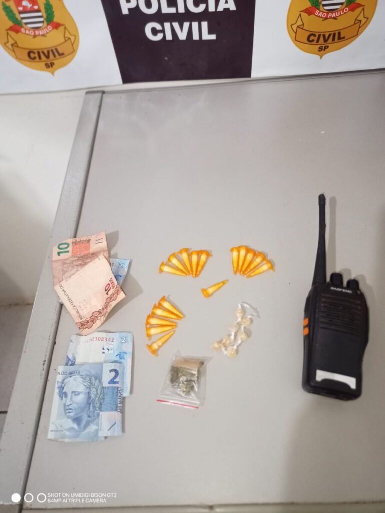 Relato dos policiais – Os integrantes da Delegacia de Polícia de São Manuel contaram que por volta das 11h20min, ao realizarem diligências para apurar caso de tráfico de drogas que ocorre na Cohab do Bairro Santa Mônica, ao acessarem a Rua Venceslau da Silva no cruzamento com a Avenida “A”, se depararam com o suspeito que, ao ver a viatura, jogou algo ao solo mantendo com ele um objeto junto ao corpo. Uma pessoa que estava com uma motocicleta ao lado do suspeito foi embora antes que os investigadores pudessem abordá-la ou anotar o número da placa da moto. Abordado e revistado, verificaram que esse rapaz tinha um rádio comunicador do tipo “HT” e o rádio, inclusive, funcionava com alguém transmitido as seguintes palavras: “estão chegando…..a viatura está chegando”. No chão, próximo ao suspeito, foi encontrada a sacolinha plástica por ele dispensada e, em seu interior, encontraram uma porção de maconha, dezesseis porções de cocaína e sete porções (pedras) de crack. Os policiais conhecem o autor contra quem há denúncias da prática de tráfico. Indagado no local da abordagem e, mais tarde nesta delegacia, ele alegou que havia acabado de “achar na rua” o rádio “HT” desconhecendo sobre os entorpecentes encontrados próximo a ele. Com o autor foi apreendida a quantia de dezesseis reais em dinheiro. Em deslocamento até a casa desse rapaz, os policiais comunicaram o irmão dele a respeito de sua prisão.