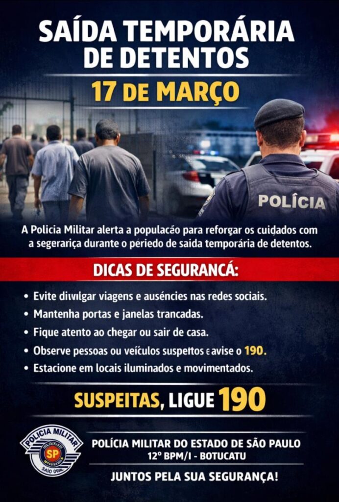A Polícia Militar de Botucatu divulgou que a partir do dia 17 de março terá início um novo período de saída temporária de detentos do sistema prisional.