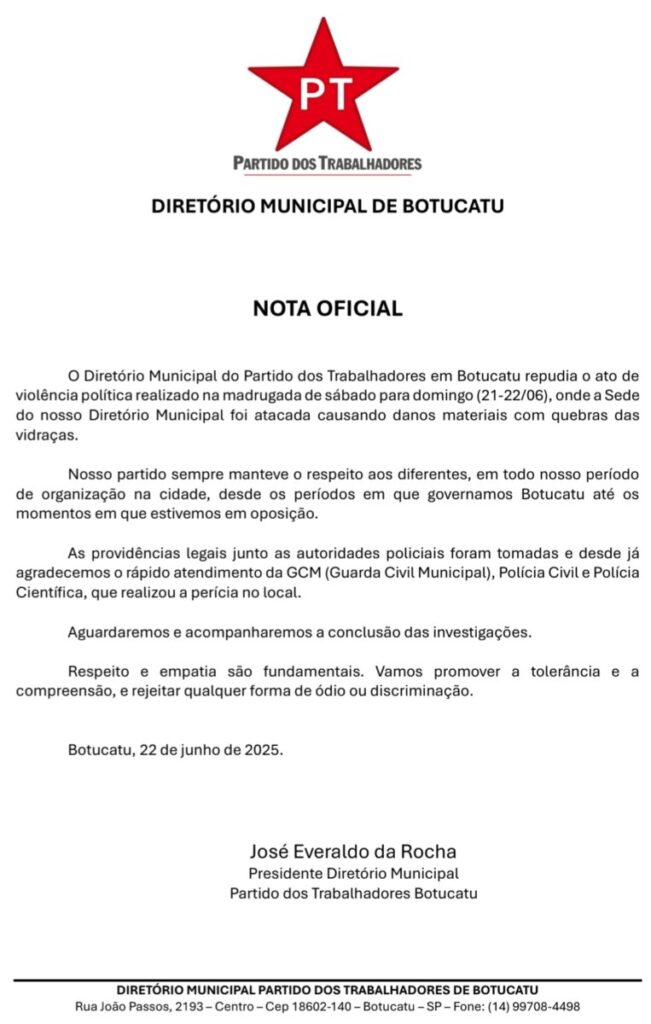 A sede do PT – Partido dos Trabalhadores de Botucatu foi alvo de vandalismo.