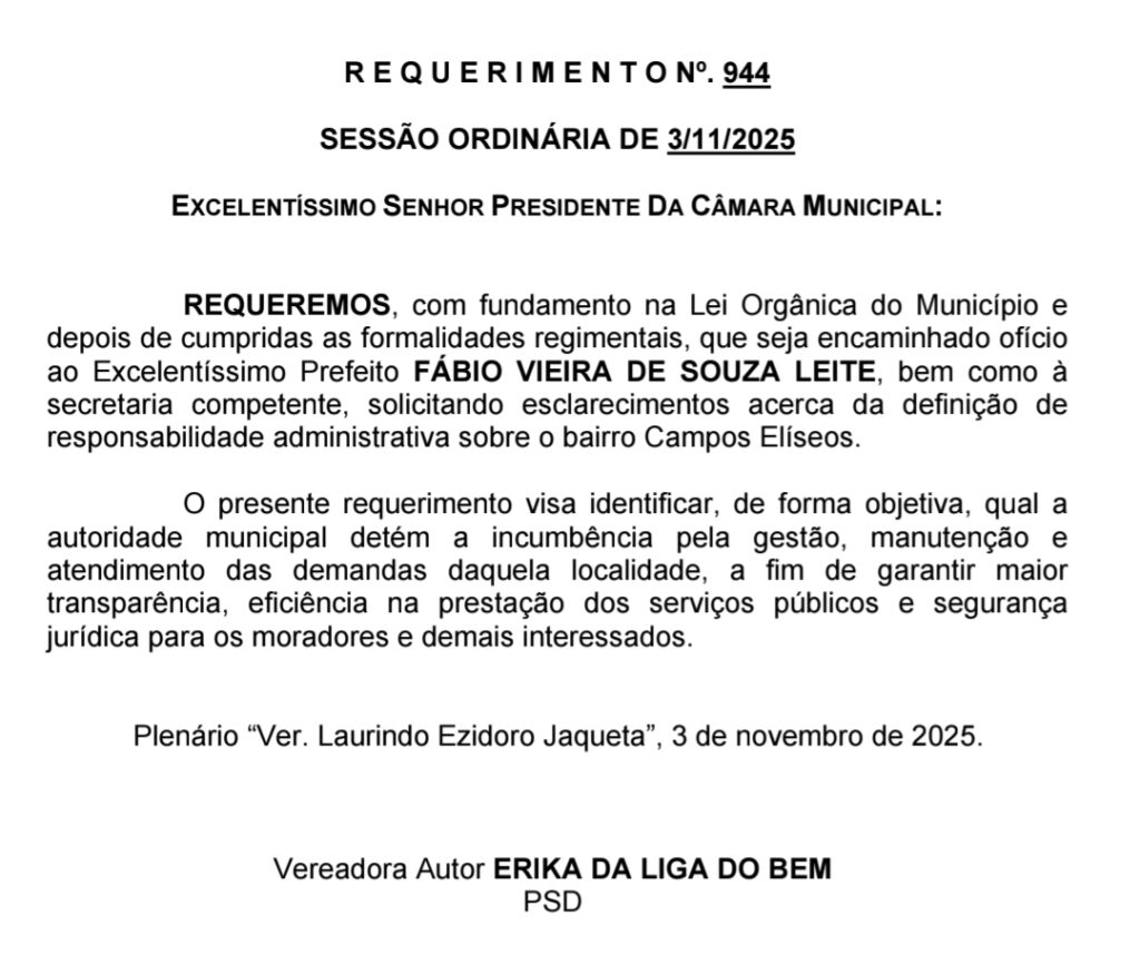 - Requerimento n°. 944, ao Prefeito, solicita esclarecimentos acerca da definição de responsabilidade administrativa sobre o bairro Campos Elíseos.
