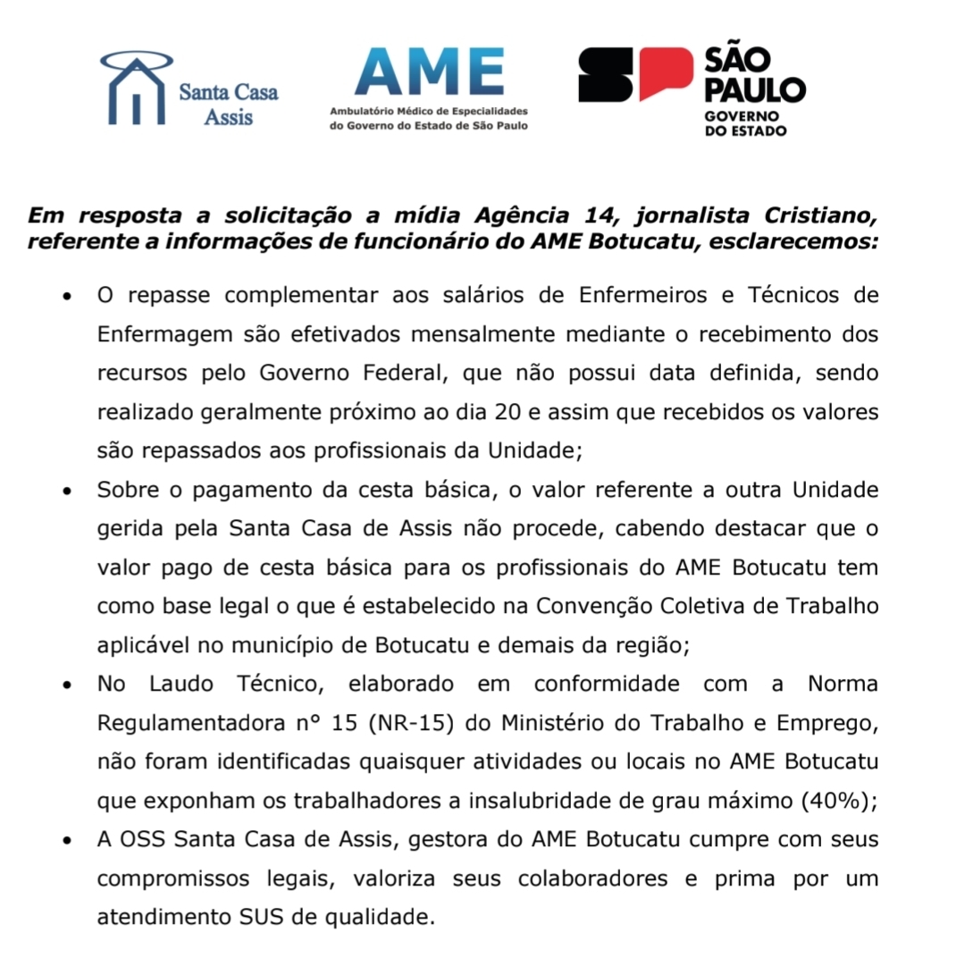 Nesta sexta-feira, 21 de novembro de 2025, a reportagem do 14News voltou a ser procurada por funcionários da enfermagem do AME – Ambulatório Médico de Especialidades de Botucatu.