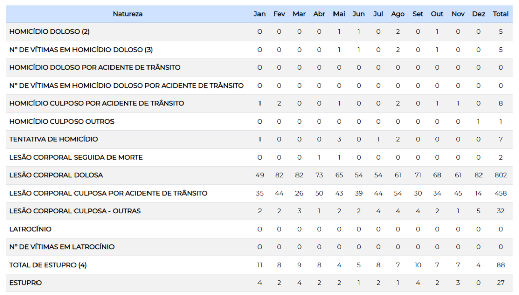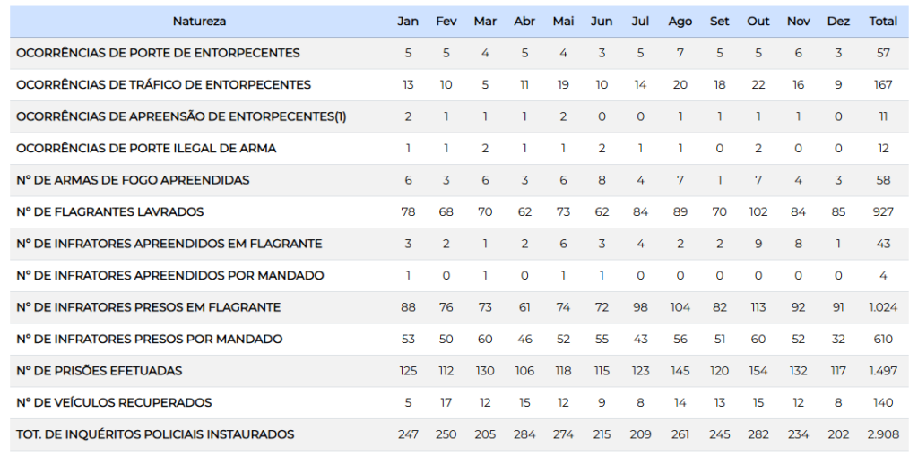 A reportagem do 14News fez um levantamento dos crimes registrados em Botucatu bem como o resultado do trabalho das forças de segurança. Destaque para a redução de roubos e o aumento de furtos. Sobre a produtividade policial foram 1.024 presos em flagrante e 610 por mandado. Veja as tabelas: