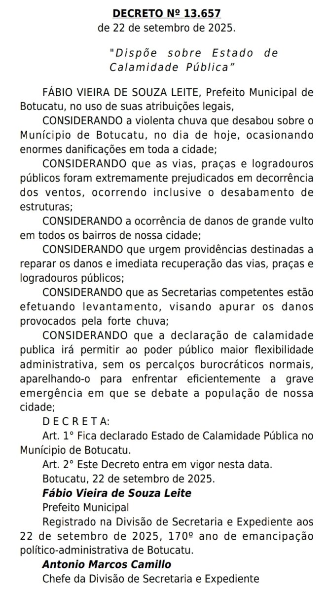 Diante da gravidade da situação, o prefeito Fábio Leite assinou o Decreto nº 13.657/2025, que estabelece estado de calamidade pública em Botucatu. Imediatamente, foi convocada reunião de emergência com todas as secretarias e órgãos municipais para organizar as ações de resposta e garantir atendimento rápido às demandas da população.
