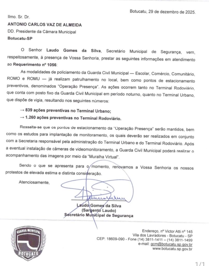 As modalidades de policiamento da Guarda Civil Municipal – Escolar, Comércio, Comunitário, ROMO e ROMU – já realizam patrulhamento no local, bem como pontos de estacionamento preventivos, denominados “Operação Presença”. As ações ocorrem tanto no Terminal Rodoviário, que conta com posto fixo da Guarda Civil Municipal em período noturno, quanto no Terminal Urbano, que dispõe de vigia, resultando nos seguintes números: