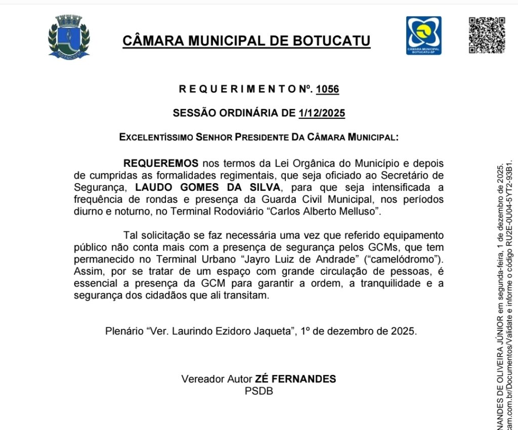 O vereador José Fernandes de Oliveira Jr, do PSDB, apresentou em dezembro do ano passado um requerimento solicitando para a Secretaria Municipal de Segurança patrulhamento no terminal rodoviário para evitar problemas aos passageiros e frequentadores.