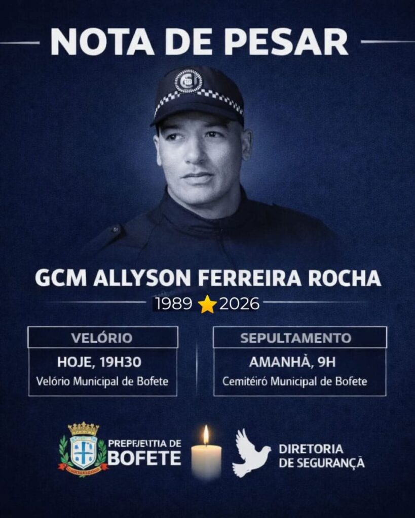 A Prefeitura Municipal de Bofete, por meio da Diretoria de Segurança manifesta profundo pesar pelo falecimento do GCM Allyson F. Rocha, servidor que dedicou seu trabalho à proteção e ao cuidado com a população de Bofete.